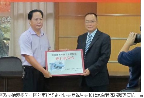 2011年10月12日下午,我院又迎来了一件大喜事!在惠城区政府225会议室,隆重举行了惠城区政协和区外商投资企业协会向我院无偿捐赠碎石机的捐赠仪式。区政协主席林玉坤、区政府副区长刘恒蓉、政协常务副主席刘光明、区卫生局局长江南、我院院长马显力等领导参加了仪式。