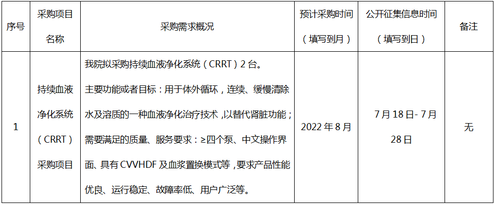 供应商在有效的公开征集时间内以自愿为原则主动向医院提供采购项目的相关信息,如:供应商名称及资质、产品品牌、技术参数、价格、售后服务等。本次公开的采购意向是本单位项目立项前的市场调查,采购项目具体情况以相关采购公告和采购文件为准。