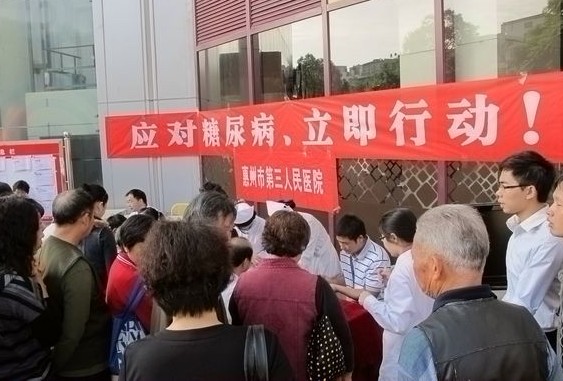1114是第五个联合国糖尿病日,今年的糖尿病日主题是应对糖尿病、立即行动。为提高政府和社会各界及广大民众对糖尿病的认识,有效普及糖尿病防治知识,1113日上午9时至11时,惠州市卫生局健康教育所联合市第三人民医院在市区港惠购物中心广场东门举行了“2011年联合国糖尿病日大型义诊活动,活动吸引了近300市民前来参与义诊和咨询,其中大部分为中老年人,且早早就在活动现场等候医护人员的到来。