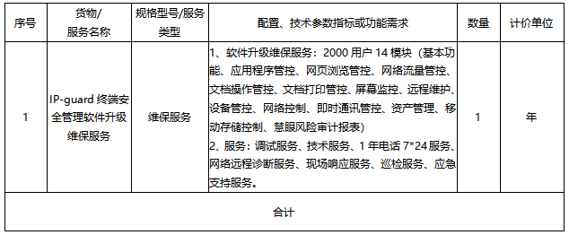 1、软件版本升级:在质保期间,对采购人终端安全管理软件2000用户14模块,提供软件版本升级服务;需升级到高于目前使用的软件版本:4.71.0203.0。
