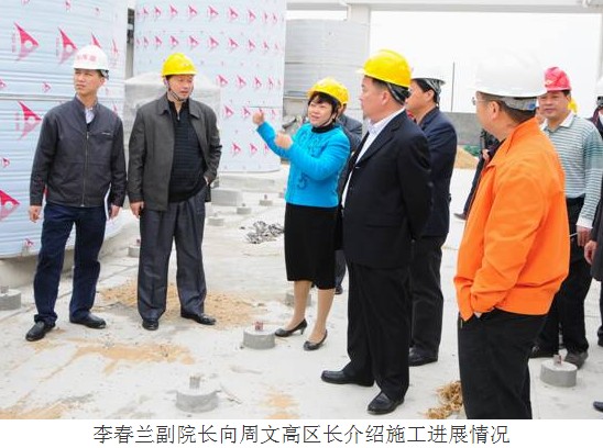周文高区长等领导一行首先在我院马显力院长、李春兰副院长的陪同下到综合大楼工地现场察看。李春兰副院长向领导们简要介绍了大楼的施工进展情况,并解答了领导们提出的相关问题。在调研现场周文高区长肯定了大楼的施工质量,并要求各参建单位大楼建设抢工不可乱工序、赶工不能忘质量。