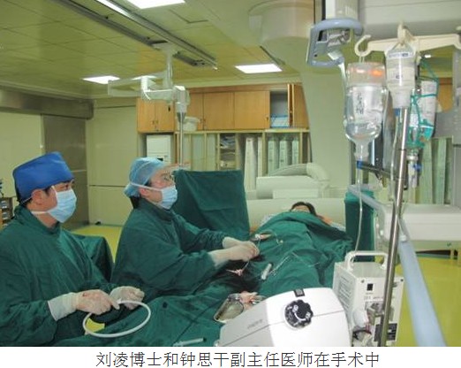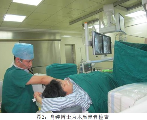 完善各种术前准备后,2月23日上午刘凌博士在大型C臂X线机的引导下,首先经股动脉进行了主动脉弓部造影,确定了未闭的动脉导管的位置、长度和直径,再从股静脉把细长的的导丝经右心房、右心室、肺动脉,通过动脉导管(漏口)“长途跋涉”到达降主动脉,然后将一个特制的伞型封堵器沿导丝送到漏口处释放,把漏口紧紧封住。经再次造影证实,漏口完全被封堵,原来的心脏杂音完全消失,手术历时仅一个小时即取得圆满成功!2月25日患者即痊愈出院!