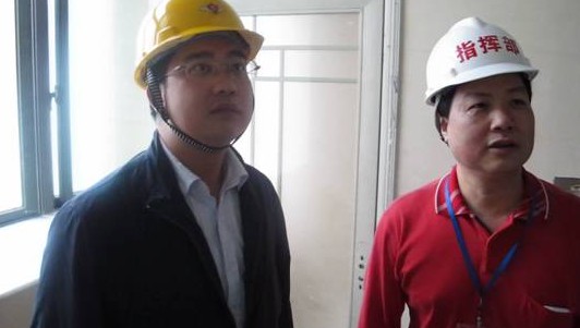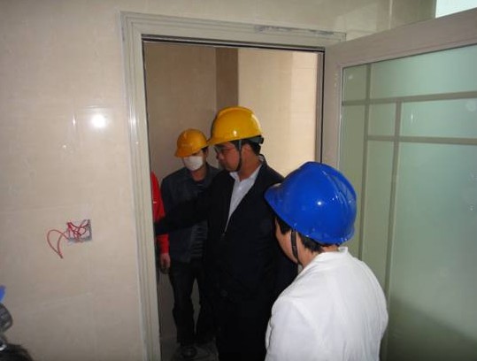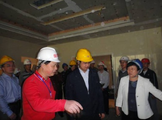 林利育常务副区长等领导一行下车后立即前往综合大楼工地现场检查建设进展情况,我院马显力院长等行政班子成员陪同检查。林常务副区长一边听取马显力院长介绍综合大楼的施工进展及大楼配套设备的采购情况,一边仔细检查大楼的施工质量,现场询问了贴墙面砖、手术间及其X线防护等具体的施工工艺,并肯定了大楼的施工质量,同时要求以质量、安全为第一的前提安排好建设进度,保证大楼如期完工。