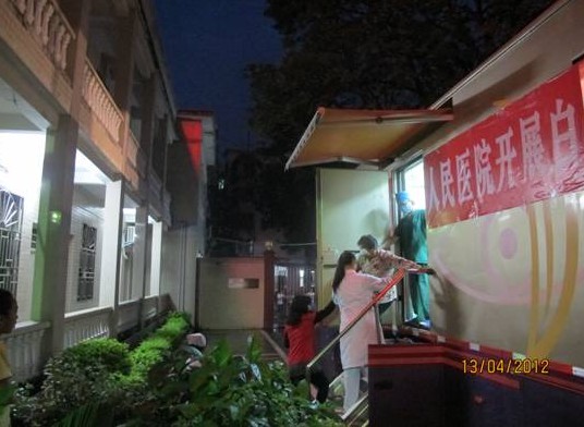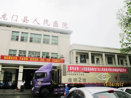 4月12日下午3时白内障巡回手术车与设备维护人员先行赶赴龙门县人民医院,当日下午5时30分左右到达龙门县人民医院,并进行设备安装调试。