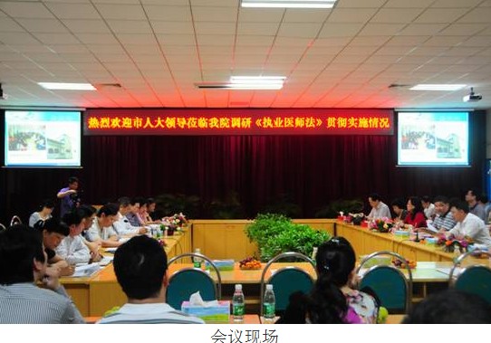 4月17日下午,市人大常委会副主任华红同志率队对我院贯彻实施《中华人民共和国执业医师法》的情况进行了专题调研。本次市人大调研旨在了解我市在贯彻实施《执业医师法》方面的做法、成效,总结存在的主要问题及汇集各方意见和建议,以加大贯彻实施工作力度,促进我市医疗队伍建设,提高医疗救治水平。本次调研座谈会由市人大教科文工委主任黄赞基同志主持,市人大调研组成员、市卫生局、区政府及有关部门领导、市三院领导班子及临床科主任参加了座谈会。