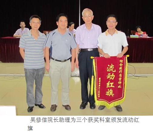 根据医院医疗质量管理规定,前综合评分前三名的科室给予通报表扬及奖励,并对第一名授予流动红旗;第一名为ICU病区,第二名为心血管医学中心病区,第三名为乳腺科。由李春兰副院长宣读通报表扬,吴修信院长助理对获奖科室进行颁奖。