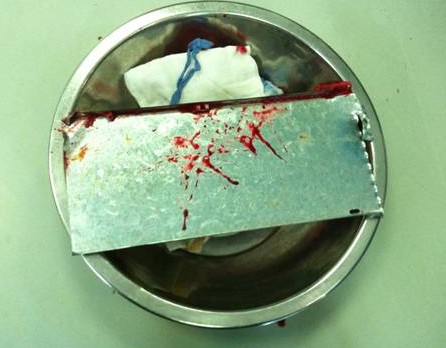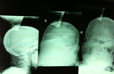 可能一辈子都没有见到过这一幕,你能想象吗?一块60cm*90cm左右的钢板直挺挺地插入脑袋里的画面吗?连“久经沙场”的我们都吓一跳。那是一种你见后全身毛孔放大,无限唏嘘的一幕,也只能在医院这个特殊的职业场所里才会出现。