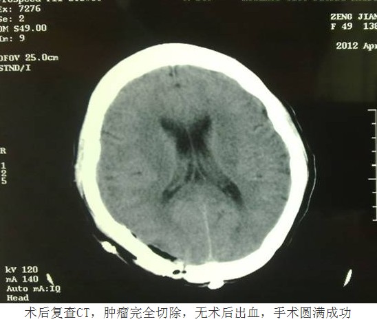 凭借先进的技术与丰富的经验,换来的是患者快速的康复。由于手术核心部分均是在显微镜下操作,在完整切除肿瘤的同时,最大限度减少了对周围正常脑组织的损伤,术中出血很少,因此术后患者没有出现任何中枢感染、神经功能障碍等异常情况,复查头颅CT显示肿瘤完整切除,无术后出血。术后第十天,患者即痊愈出院。