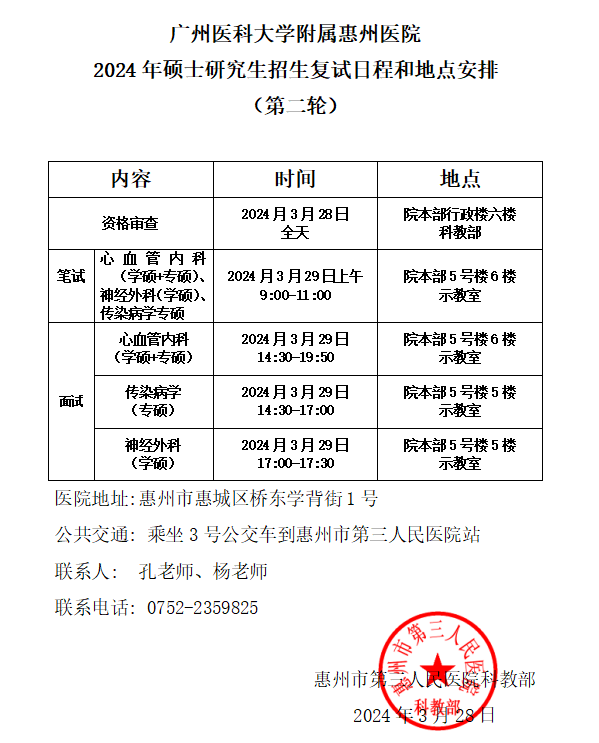 广州医科大学附属惠州医院2024年硕上研究生招生复试日程和地点安排(第二轮)