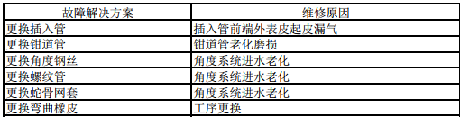 插入管前段有破损漏气,经检修插入管破损,橡皮破损。另外检修发现角度系统老化、钳道管老化,需要更换,详见附件2;