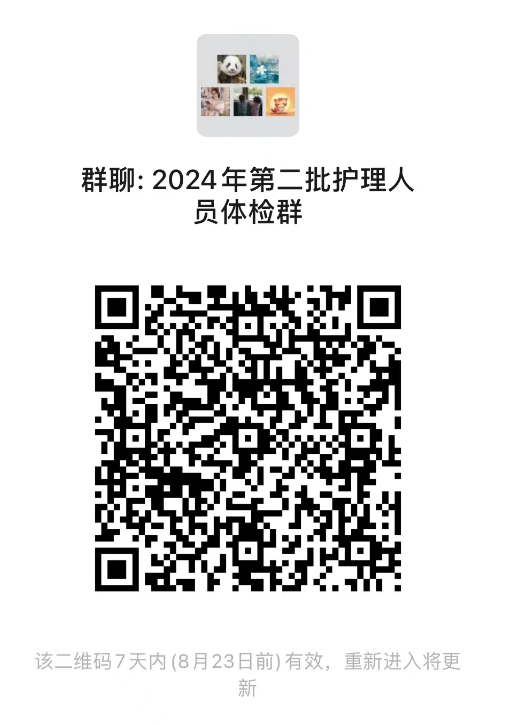 我院于2024年8月15日举行了护理人员的招聘笔试及面试,现将考试成绩及名次予以公布。请进入体检环节的应聘者携带身份证原件前往我院东院区健康管理中心进行体检,并于8月21日前完成体检。我院入职体检仅在工作日开放,请合理安排时间,体检咨询电话:2359719,入围人员请扫描上方二维码入群。