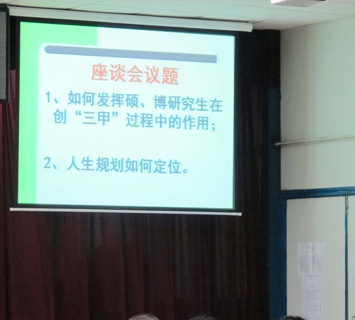 马显力院长作了最后的总结和寄语。一是关于创“三甲”的重要性、艰巨性、可行性。二是寄语广大研究生,做事要先学会做人,团结协助,认清自己的优点与不足,多看看和学习别人的优点;尽快地进行文化融合,多理解、多包容。