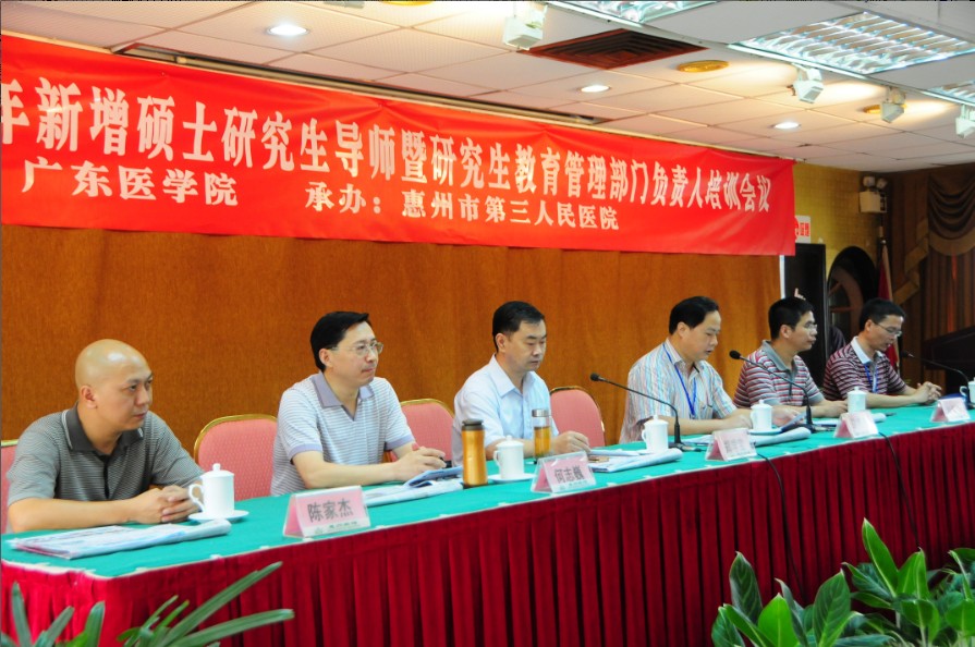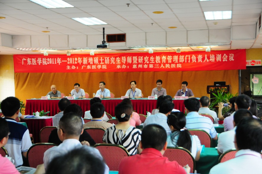 8月26日上午,“广东医学院2011-2012年新增硕士研究生导师暨研究生教育管理部门负责人培训会议”在惠州宾馆碧云楼会议室隆重举行,本次会议由我院与广东医学院联合举办,共有60余名研究生导师及18名相关医院科教科主任参加了培训学习。广东医学院郑学宝院长、研究生学院何志巍院长、陈家杰书记、刘华锋副院长,我院马显力院长、科教部简希尧主任,新增导师许汉标副院长、内一区吴峰主任、内三区肖纯主任、李桂平主任、内四区黄志勇主任,乳腺科张树平主任参加了开班典礼,典礼由简希尧主任主持。