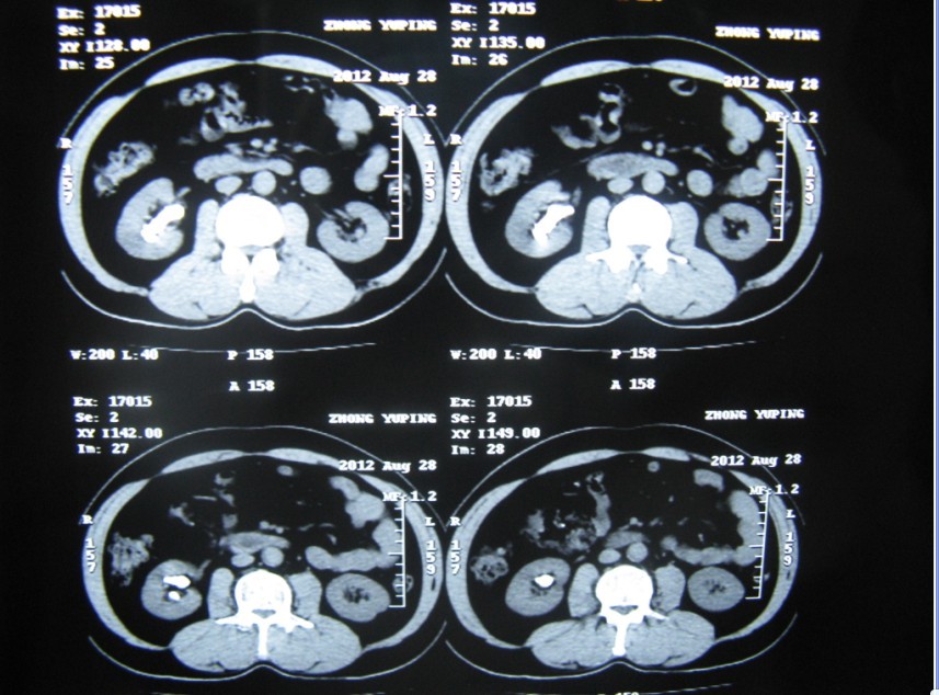 图3 术前CT片可以看到结石位于右肾盂及中下各盏,无肾积水
