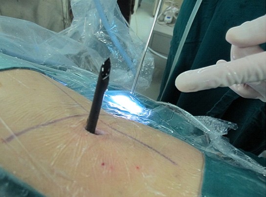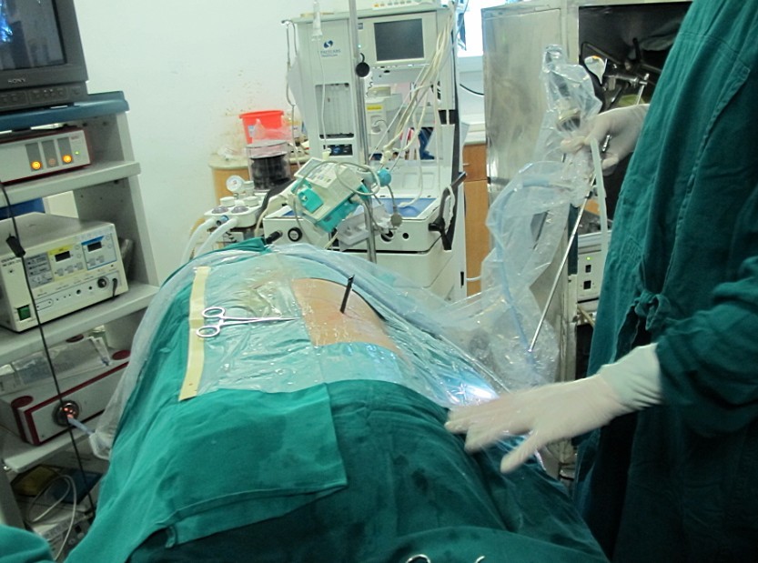 图7 术中杨伟忠主任在观察单通道出水情况。