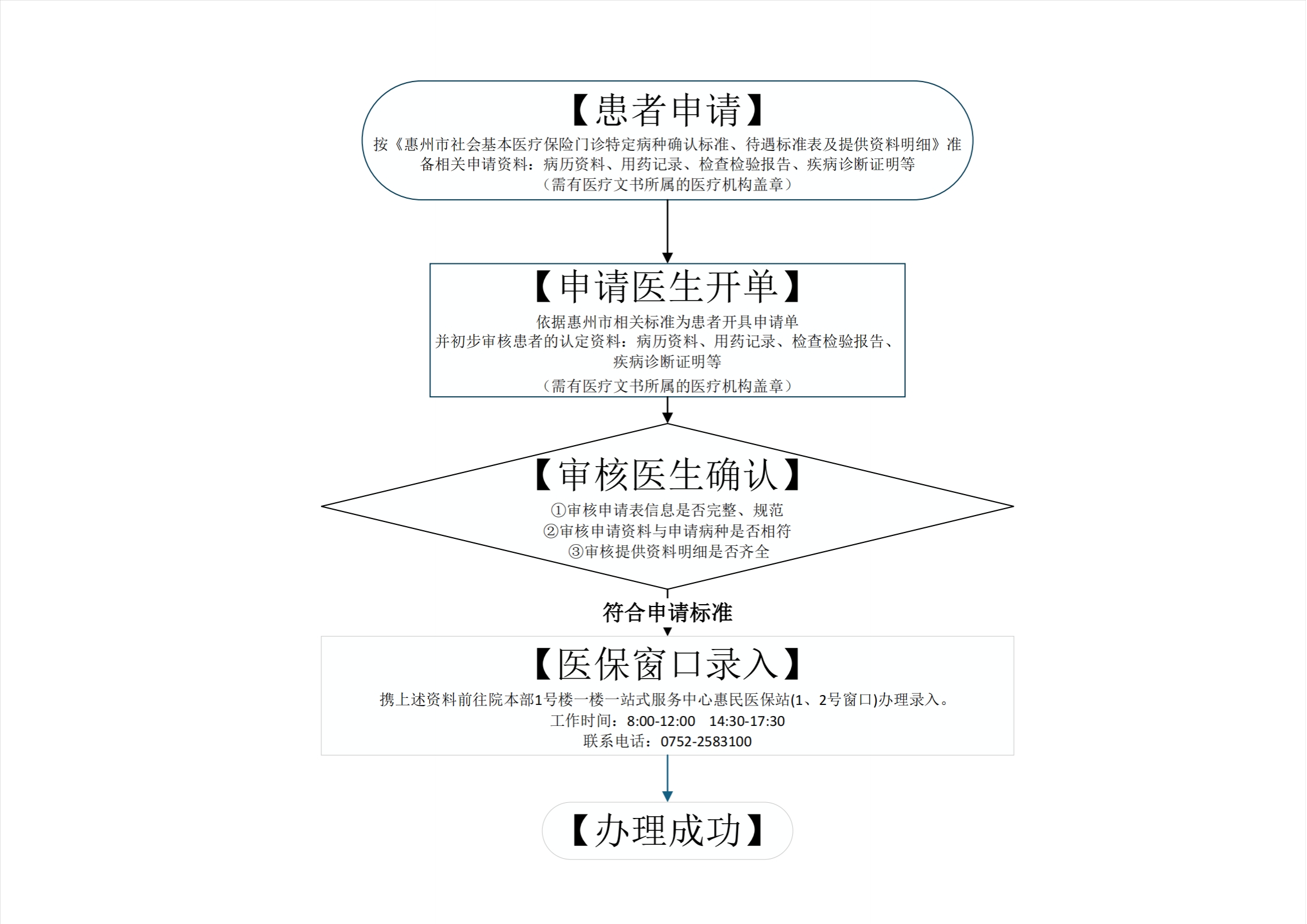办理流程如下:参保人持相关就医病历资料前往对应专科→申请医师审核条件符合后填写《惠州市基本医疗保险特定门诊申请审批表》→对应病种的审核医师签字确认→相关资料提交至惠州市第三人民医院总院区1号楼门诊一楼“一站式服务中心”1号、2号窗口“惠民医保站”进行资料录入。
