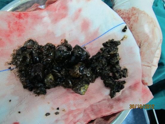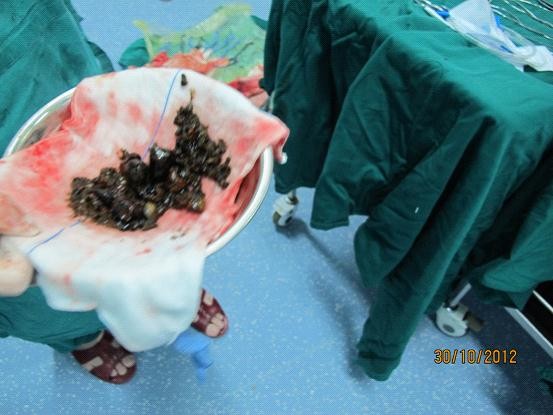 在手术过程中,出乎大家意料的是这位患者的结石异常地多,黄主任肯定的说,这是他执业以来见过结石数量最多的患者。叶教授也指出这位患者应该是先天母体营养缺乏,才导致这么厉害的结石堵塞。在胆总管探查中,就取出5、6块板栗状大小的结石,当时我们就很惊奇。更意外的是,在整个肝里更有许许多多结石堵塞。黄主任在手工无法清除肝内结石的情况下,果断在胆道镜的协助下,十分耐心地取出患者肝内所有结石,成功完成手术。