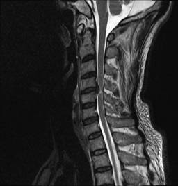 图1 术前颈椎MRI提示颈椎退行性变,C4/5椎间盘突出、脊髓出现高信号改变,C4硬膜囊受压变形