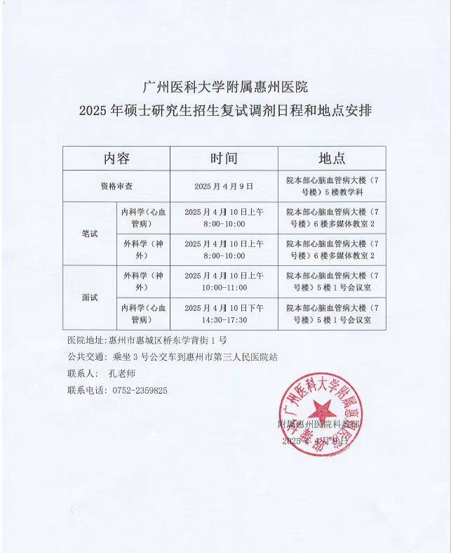 广州医科大学附属惠州医院2025年硕士研究生招生复试调剂日程和地点安排