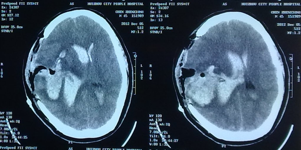 这是一位44岁的男性患者,因突发不省人事1小时急诊入院,初步诊断可能是右颞顶脑内血肿并脑疝、右颞顶动静脉畸形。因为脑疝形成需要急诊手术,术前无法作进一步检查来明确出血的原因,为了安全,第一次只作血肿大部分清除术,使脑疝缓解,瞳孔回缩,并不冒险深入探查。但是术后不久瞳孔又再次散大,复查头颅CT提示再出血,出血量超过第一次,约100多毫升,广泛占据大半个脑组织,形成巨大脑内血肿并脑室铸型血肿,深昏迷,濒死状态,若在以往该患者必死无疑。