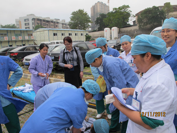 随着外科综合大楼飘出的烟雾,参与演练的保安人员迅速在各个消防通道通过手势和指令引导大家撤退到安全区域,院领导到现场指挥,手术室在主任和护士长的指挥下,迅速组织麻醉医生,护士及运送部人员搬运手术病人逃生,手术室与其他科室不同,病人生命支持情况复杂,环境密闭。如果刚好在手术过程右大出血的病人,我们应该立即用止血钳夹闭出血点,给与纱快填充止血,用无菌敷料先包裹关闭体腔迅速转运。全麻病人要与麻醉师一起用简易呼吸器和药品保证患者生命体征维持,与手术医生,麻醉师,护士一起将病人撤离手术间到安全地方。