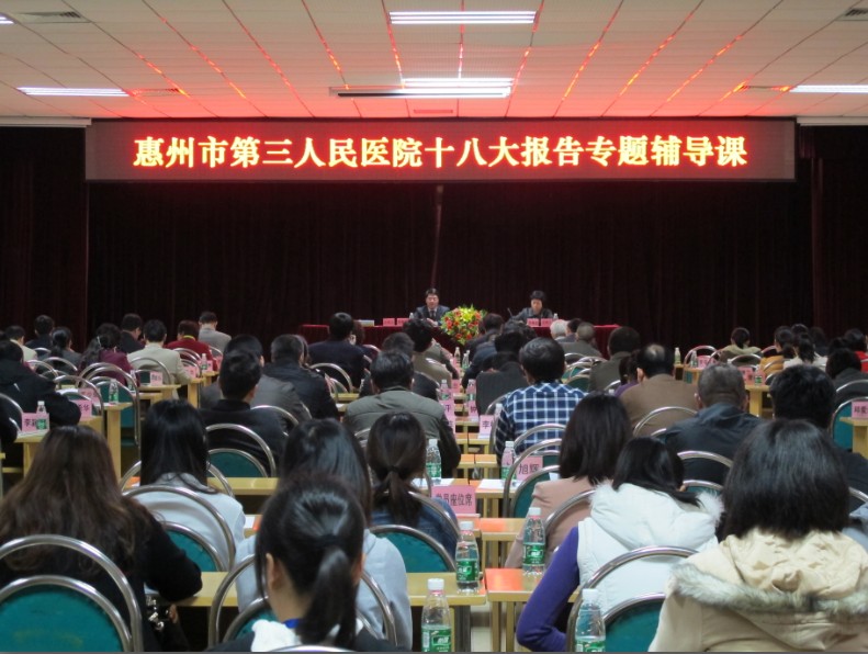 2012126下午,惠州市第三人民医院在工地会议室举办以“坚定不移沿着中国特色社会主义道路前进为全面建成小康社会而奋斗”为主题的十八大报告专题辅导课,中层干部和党员约250人参加了这次辅导课。区委党校陈春梧副校长精彩的讲课迎来全场阵阵热烈的掌声。