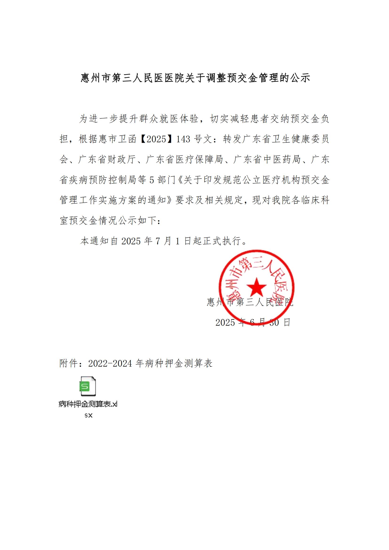 惠州市第三人民医医院关于调整预交金管理的公示