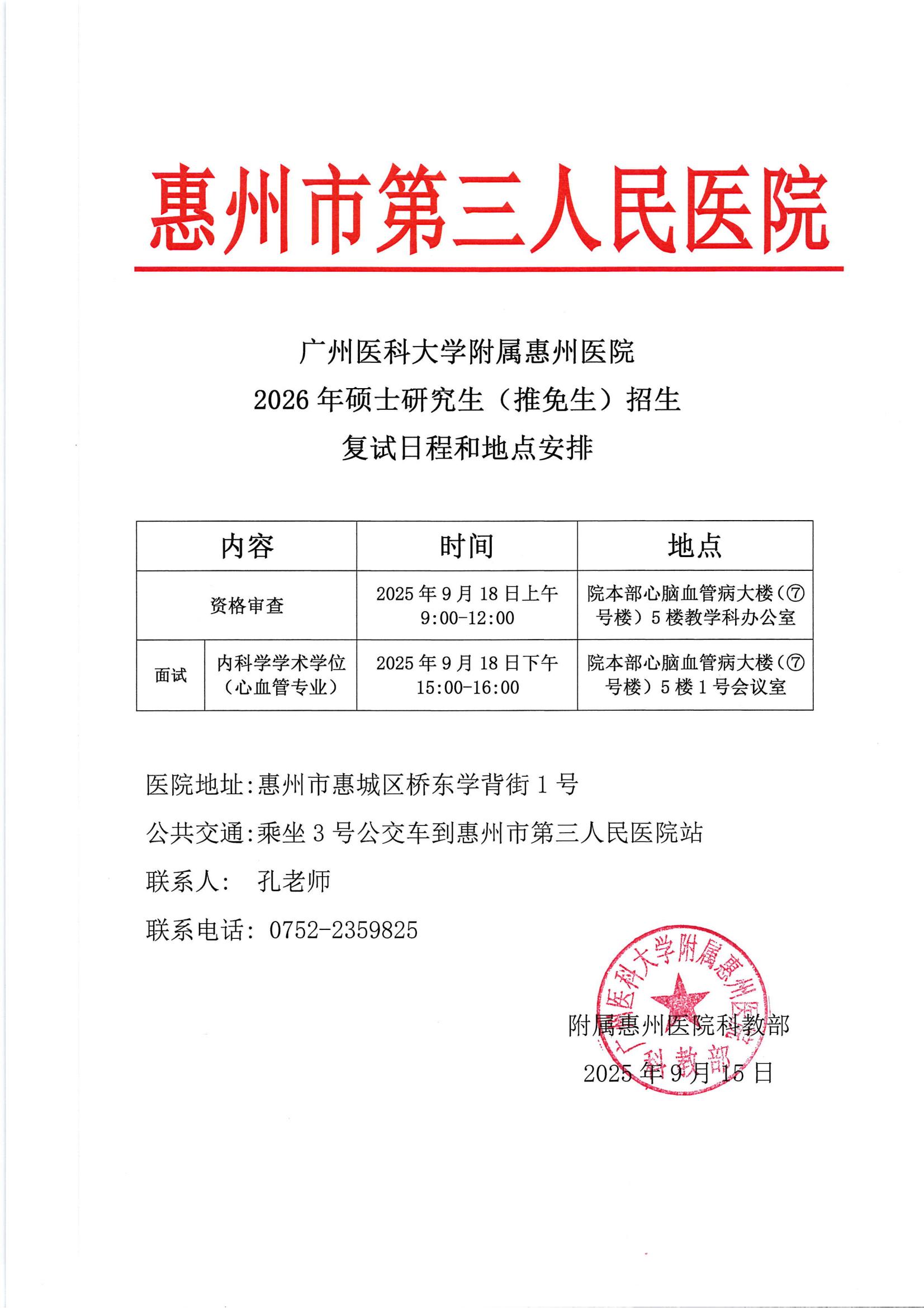 广州医科大学附属惠州医院2026年硕士研究生(推免生)招生复试日程和地点安排