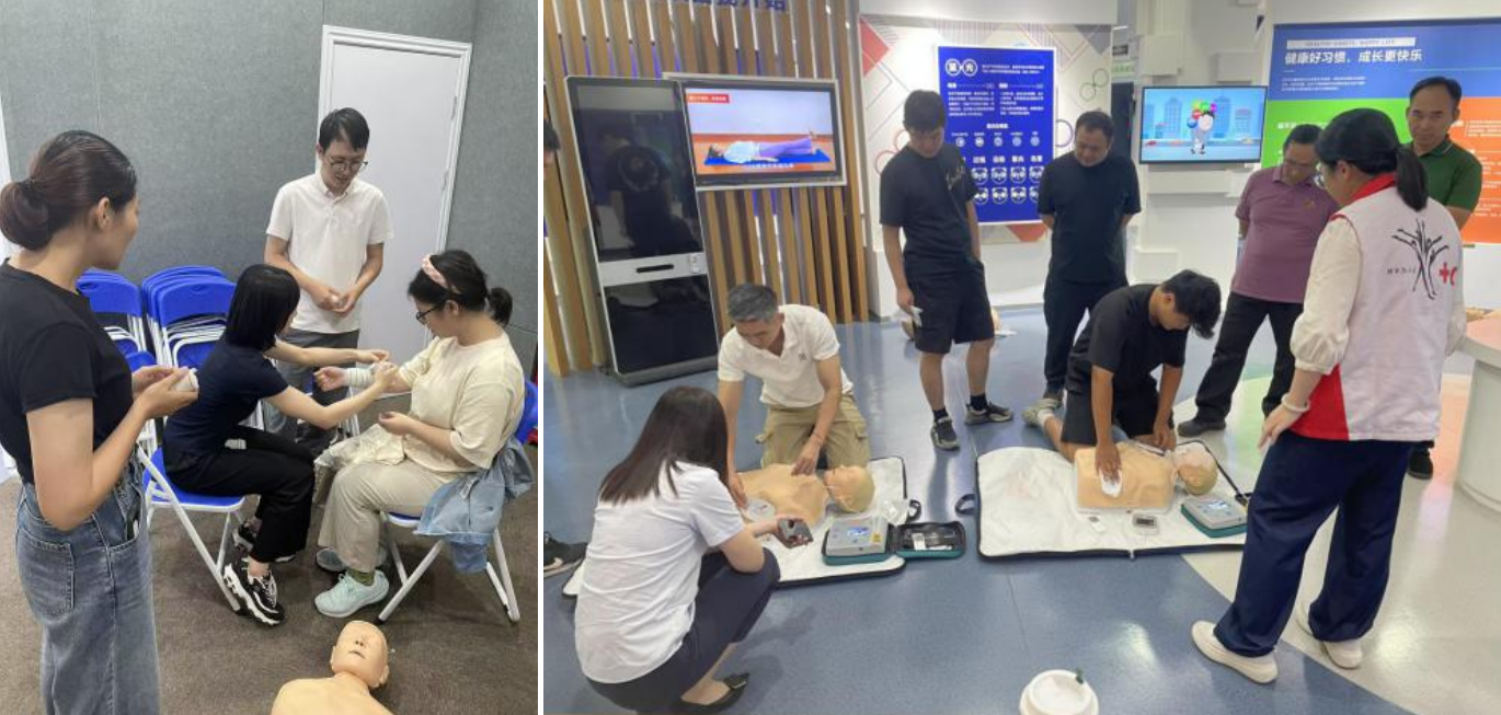 培训期间学员们踊跃参加实践演练,借助人体模型对心肺复苏、AED、创伤止血与包扎的全部环节和步骤都进行了模拟操作,现场气氛非常活跃。