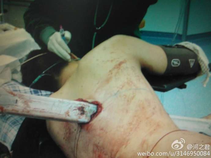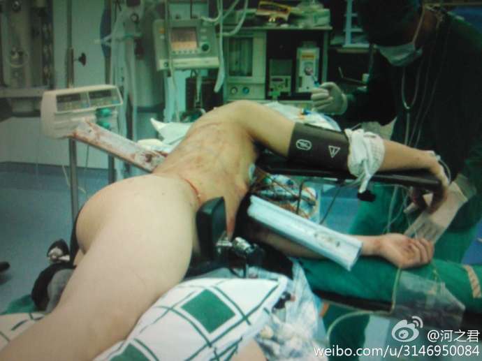 该患者为一年轻男性,一根巨大的金属护栏从他的右侧胸部穿透过,两端露出的长度均有10余公分长,伤口处不断流出大量的鲜血。患者意识淡漠,全身冰凉,血压测不到,生命危在旦夕!患者此时意识已不清,未缴纳住院费用,但为抢救患者生命,我院立即启动绿色通道,完善术前准备,急诊送入手术室急诊手术!