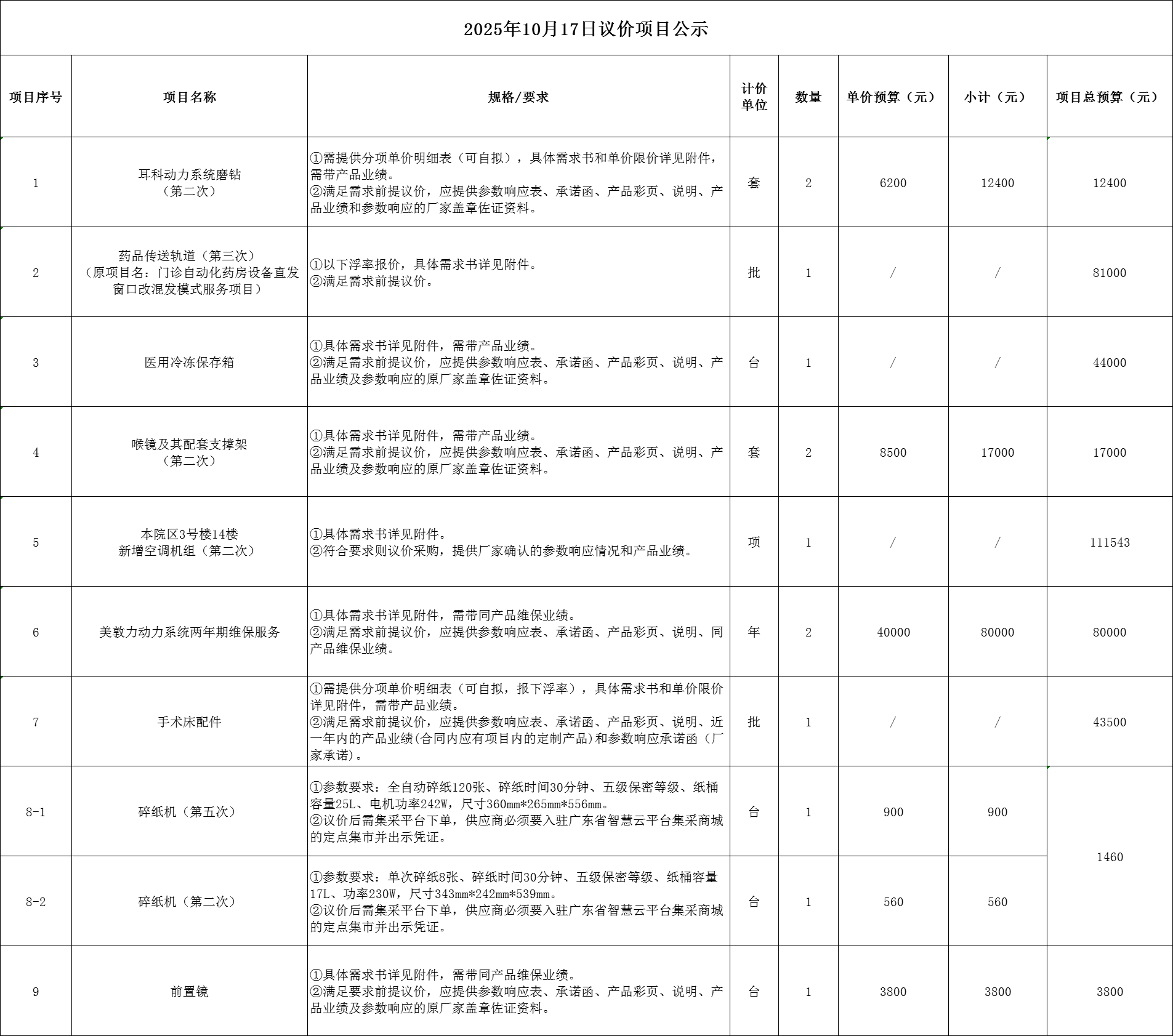 1.符合资格的供应商应当在公告发布之日起至2025年10月16日00:00前在公告文章末尾(入口:惠州市第三人民医院官网→采购公告→20251017议价项目公示页面)下载附件获取议价文件(含报名、报价文件模板及议价项目相关附件等)。