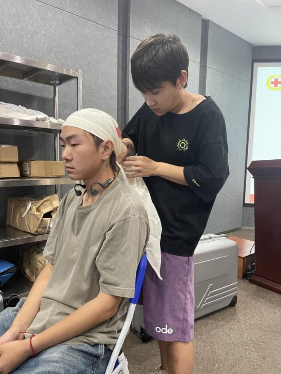 导师温伟莲介绍常见创伤类型对应的止血方法,如直接加压、止血带使用、填塞止血等,讲解不同部位包扎技巧与材料选择。强调快速止血对挽救生命的重要性,示范环形、螺旋、八字等包扎方式。通过案例模拟,强化学员对伤情判断与处理流程的掌握。