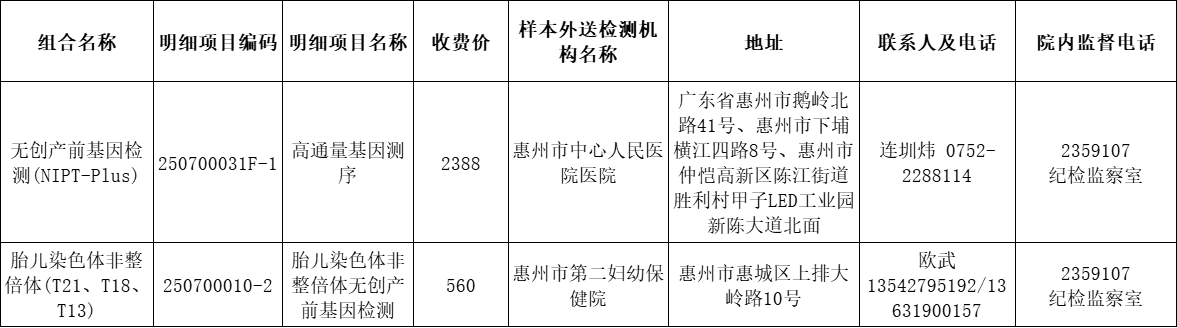 惠州市第三人民医院外送检验项目收费公示(惠州市中心医院、惠州市第二妇幼保健院)