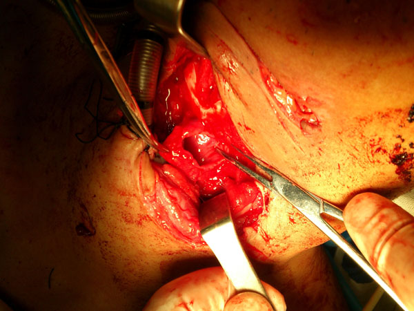 患者颈部正中可见2处深切口,切面整齐。耳鼻喉-头颈外科王豪主任和邹凤主任在初步检查后发现幸好没有伤及颈动脉血管,这也是病人坚持到现在的主因。此时发现气管内气道压十分之高,估计由于伤口长时间血块凝固,纱布干凅粘连及转运过程中可能脱出。麻醉师只能在如此困难下重新气管插管,后发现气管已断,只有在初步清创后立即再次行气管切开并重新置管。再次清创伤口检查发现此时喉部、气管、食道已经完全离断。