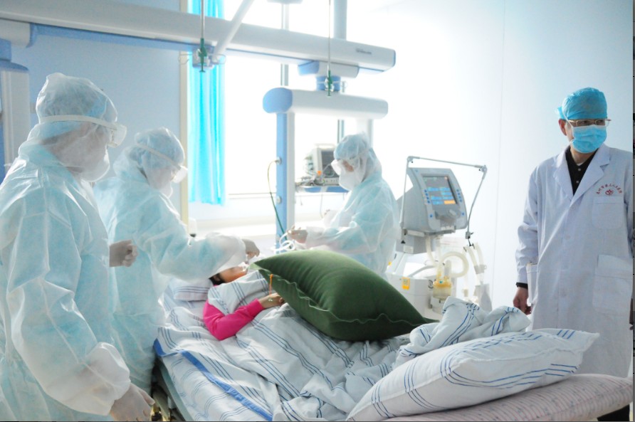2)重症监护室单人隔离负压病房内,查看医护人员在三级防护下为病人进行气管插管操作,呼吸机辅助呼吸。