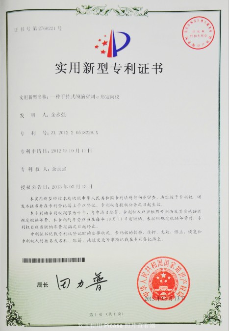 该发明专利名称是“一种手持式颅脑穿刺e形定向仪”,由国家知识产权局于2013年3月13日授予国家“实用新型发明专利”,专利号ZL201220518326.X,受国家专利保护。