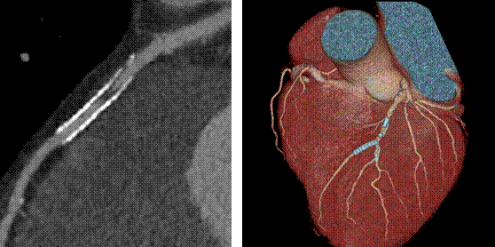 高清模式突破了传统CT对支架内斑块观察的难点,能够提供冠脉支架内腔的高清图像。