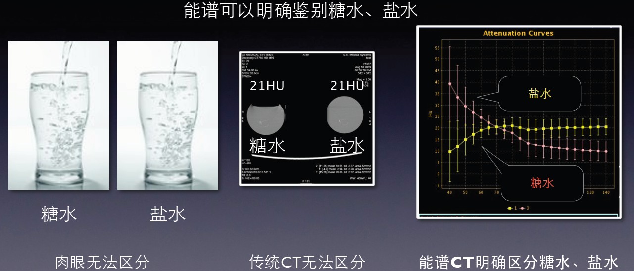 能谱曲线体现了不同物质对X线的吸收程度,从而体现了物质本身的结构特性。从以下的糖水及盐水的例子可以看出,在常规CT上表现为同样CT值-即无法区分的糖盐水却表现为完全不一样的能谱曲线,从而让我们可以区分它们。