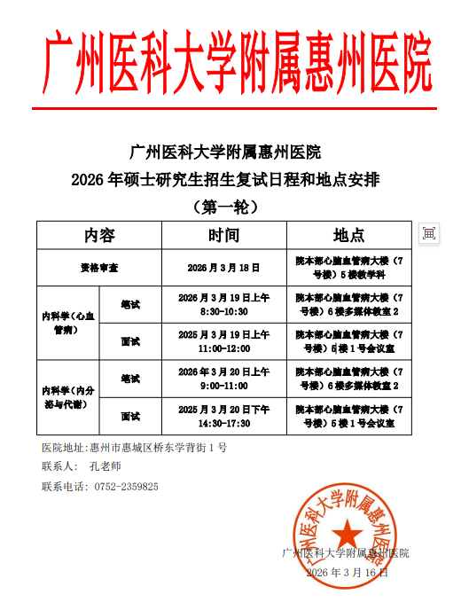 广州医科大学附属惠州医院2026年硕士研究生招生复试日程和地点安排(第一轮)