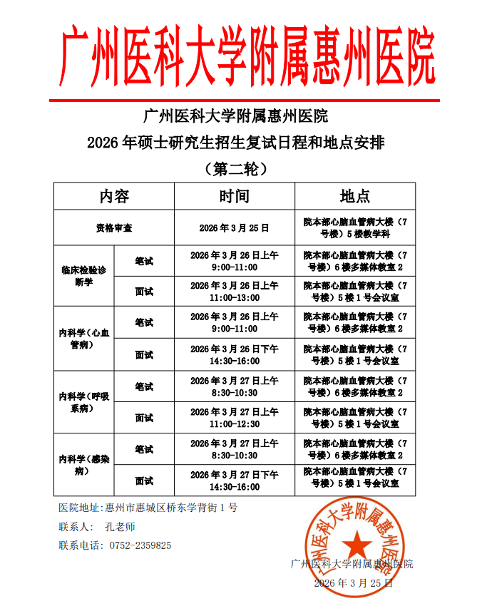 广州医科大学附属惠州医院 2026年硕士研究生招生复试日程和地点安排 (第二轮)