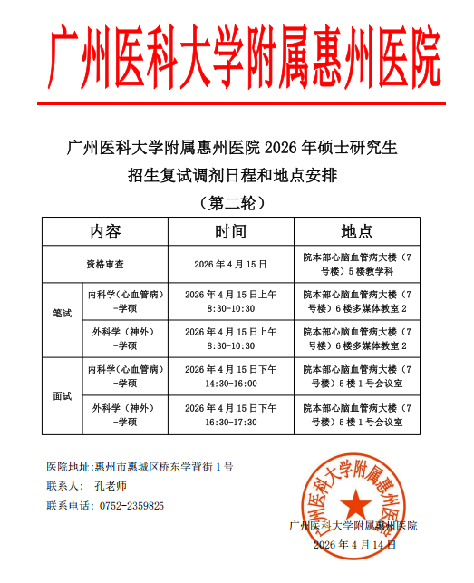 广州医科大学附属惠州医院2026年硕士研究生招生复试调剂(第二轮)日程和地点安排