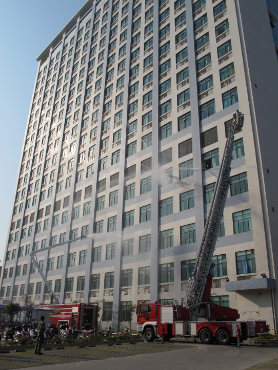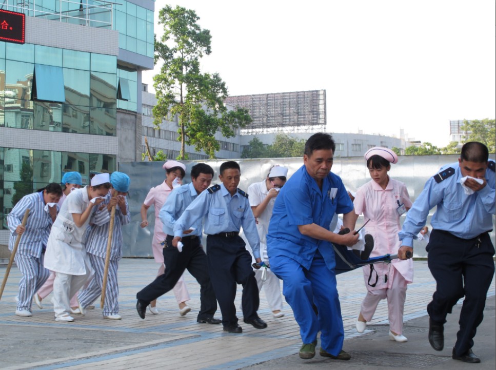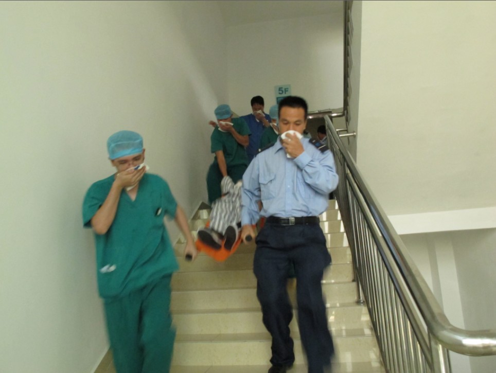 顿时麻醉科、手术室、乳腺科、ICU、妇科、新生儿科、心胸外科等各科的医护人员在科主任、护士长的带领下,紧张有序从安全通道向外撤离和转移病人。医护人员与保安及护工人员齐心协力,或用担架,或扶或搀,沿着楼梯步道,按照平时掌握的火灾逃生技能和消防急救知识,全部在最短时间内将住院病房的患者。随后各科医护人员轮流演练了用灭火器扑灭火源。就在火灾发生后,消防官兵也迅速赶到现场,及时用消防水车灭火,用云梯转移高楼层的陷入困境的人员,与三院医护人员一道圆满完成了本次消防演练。