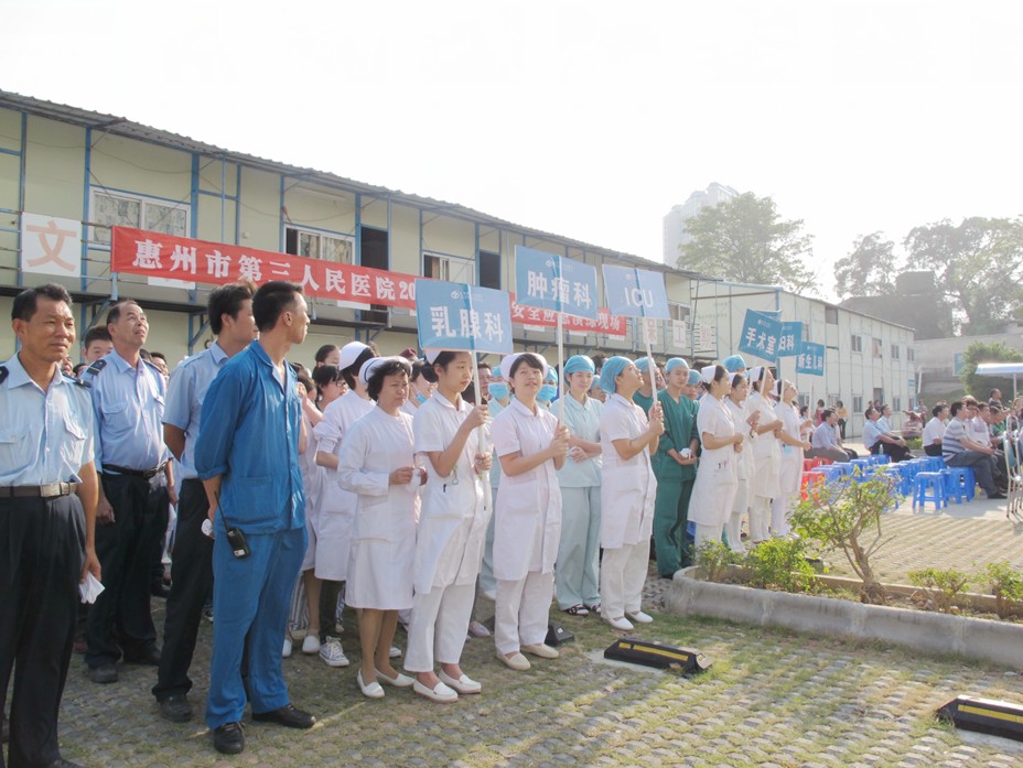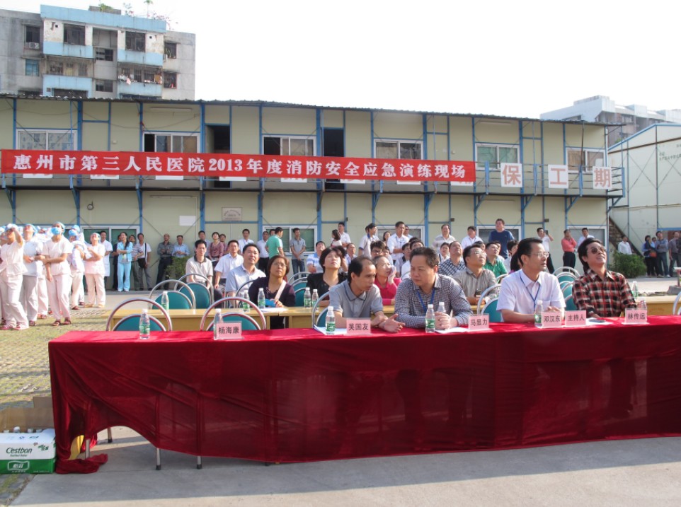 据惠城区卫生局关于加强我区医疗卫生单位消防安全“四个能力”(检查火灾隐患能力、扑救初期火灾能力、组织疏散逃生能力、消防宣传教育能力)及员工防火自救能力提升的要求,经医院消防安全管理委员会决定,我院于10月25日开展了2013年度的实地消防演练活动。