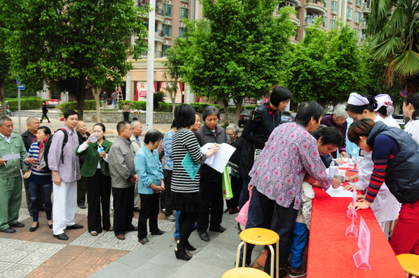 清晨的阳光和暖、温柔,成群的长者服装整齐、气定神闲的打着太极。得知活动的消息,周边的许多老人家在我们布置现场的同时已经陆续来到了广场上,找个座位边话家常边等候。长期的社区健康促进工作让街坊与我们逐渐增进了感情和默契,大家知道三院的白衣天使们又将用独具特色的形式为他们带来实用的保健常识。本次义诊活动具有鲜明的特点: