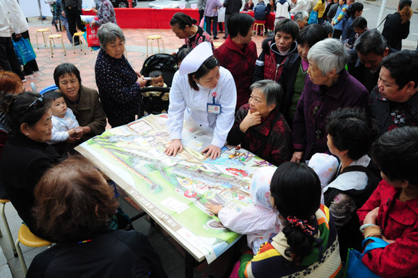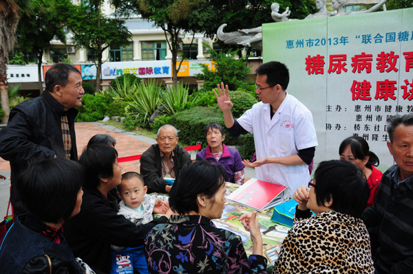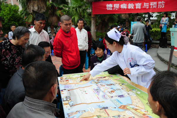 由一名医生与两名护士姑娘分三组同时带领街坊们畅游“体验游戏”的三个环节:什么是糖尿病、与胰岛素同行、糖尿病的运动与饮食。白衣天使们图文并茂的通过眼神、手势的沟通增强传播效果,为街坊们生动的加深了对糖尿病的认识。