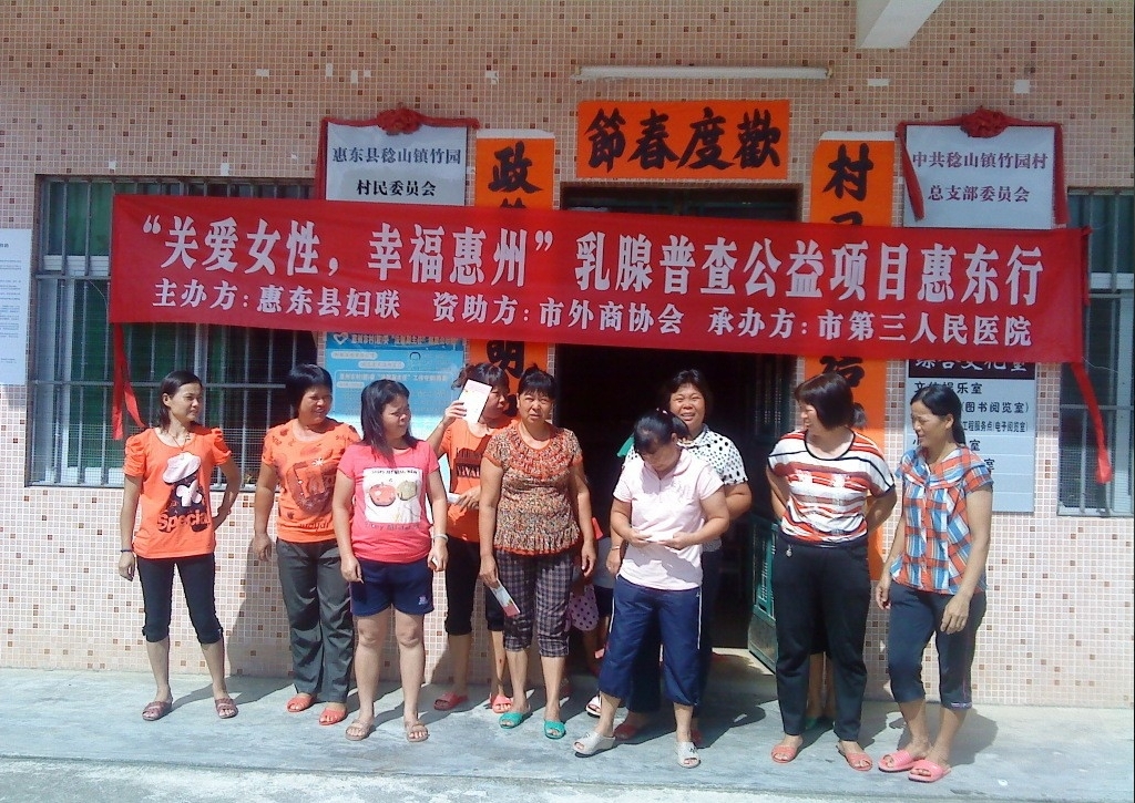 2012年的夏天,我院决定充分发挥乳腺科雄厚的技术力量和乳腺普查车流动性强的优势,为惠州广大妇女同胞开展乳腺普查。在市区两级妇联和惠州市外商投资企业协会的一致认可下,我们以政府搭台、企业资助、卫生唱戏的方式共同开展,并将其作为政府的一项公益活动,为惠州市广大妇女同胞健康服务,助力构建和谐幸福惠州。时隔一年,我院圆满完成了此项公益项目,惠州市范围内参与普查妇女共19709人次,其中阳性结果8029人次,阳性率为40.7%。
