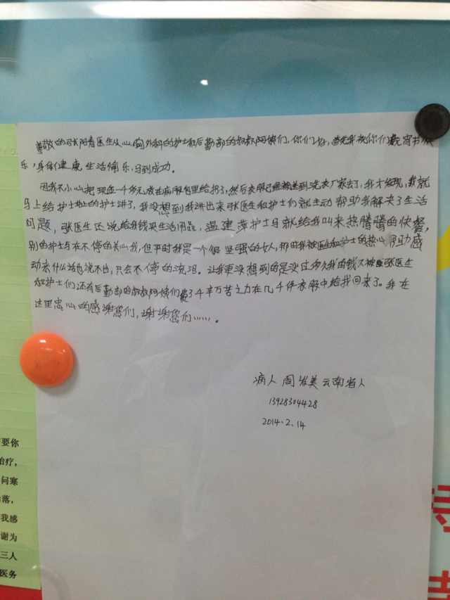 我们立刻上报相关部门马上联系洗衣厂那边,哪怕只有万分之一希望,那也得找!但原本做完心脏手术恢复迅速每天心情愉悦的阿姨,此时却非常悲伤,而之前她每天却是很开心的,还常常安慰同房的病友,开导他们,跟他们分享她成功的经历,给他们坚持的勇气。每次进去病房我们都会称赞下她,希望她的一点点鼓励能给大家点燃战胜病魔的信心。