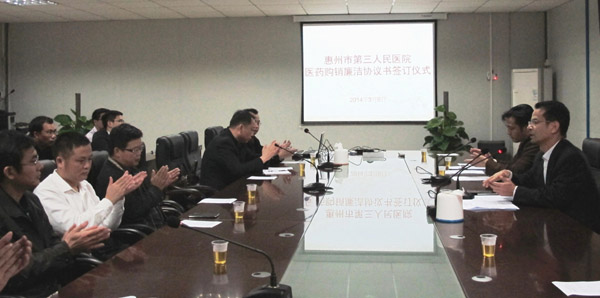 为贯彻落实《加强医疗卫生行风建设“九不准”》和《卫生计生委关于开展治理医药购销领域商业贿赂专项工作实施意见》,促进我院党风廉政建设工作深入开展,进一步规范医药购销行为,营造公平交易、诚实守信的良好环境,维护正常的医疗秩序和药品经营秩序,防止在药品、医疗器械购销中不正之风的发生,确保医院健康稳定发展,2014年3月6日,我院党委在行政会议室举行了医药购销廉洁协议书签订仪式,20多名医药、器械供应商代表出席参加。党委邓汉东书记发表重要讲话。