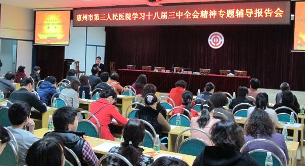 关心国家时事政治,了解党的方针政策,参与社会经济建设,这是每个党员基本要求。为深入贯彻落实党的十八届三中全会精神,加强医院党员、干部的理论学习,提升素质,增强能力,根据医院党的群众路线教育实践活动安排,2014年3月21日下午,我们特别邀请中共惠城区委党校常务副校长、区委委员陈春梧同志来院作“学习十八届三中全会精神专题辅导报告”。医院中层干部和全体党员250多人参加了此次报告会。区卫生局党委刘菊芳书记、邹忠平局长等领导出席参加。