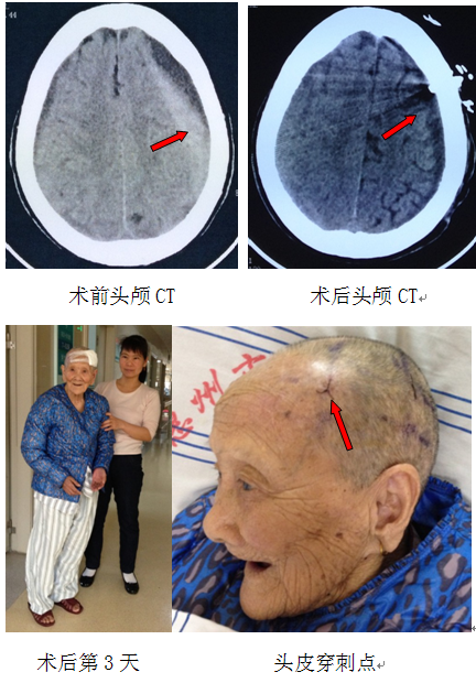 老奶奶因头痛多天,家乡经初步治疗无效后,在儿孙的陪同下就诊我院内科。行头颅CT检查提示左侧额颞顶枕巨大的硬膜下血肿,已严重压痛脑组织致神志、精神差和右侧肢体偏瘫。收住我院的神经外科,经家属同意,予第二天在局麻下行改良的“微创穿刺冲洗引流术”,手术中冲洗引流处血肿约100ml。术后第1天患者神志清楚,精神良好,右侧肢体偏瘫好转,复查头颅CT示血肿已清除。术后第2天拔除留置的引流管,术后第8天办理出院。